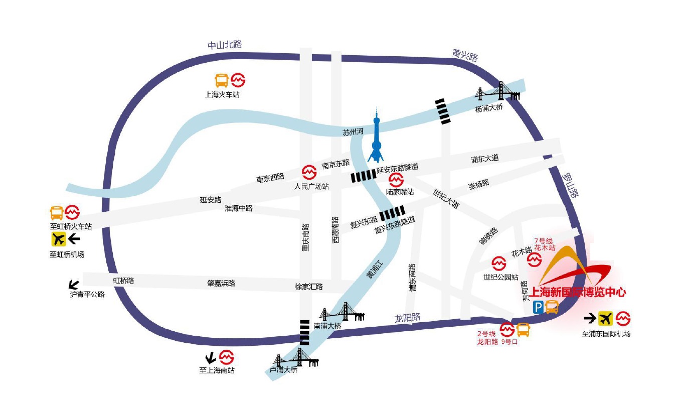 SNIEC位于龙阳路、罗山路交汇处,易于通行。从市中心横跨南浦大桥、杨浦大桥可直达。